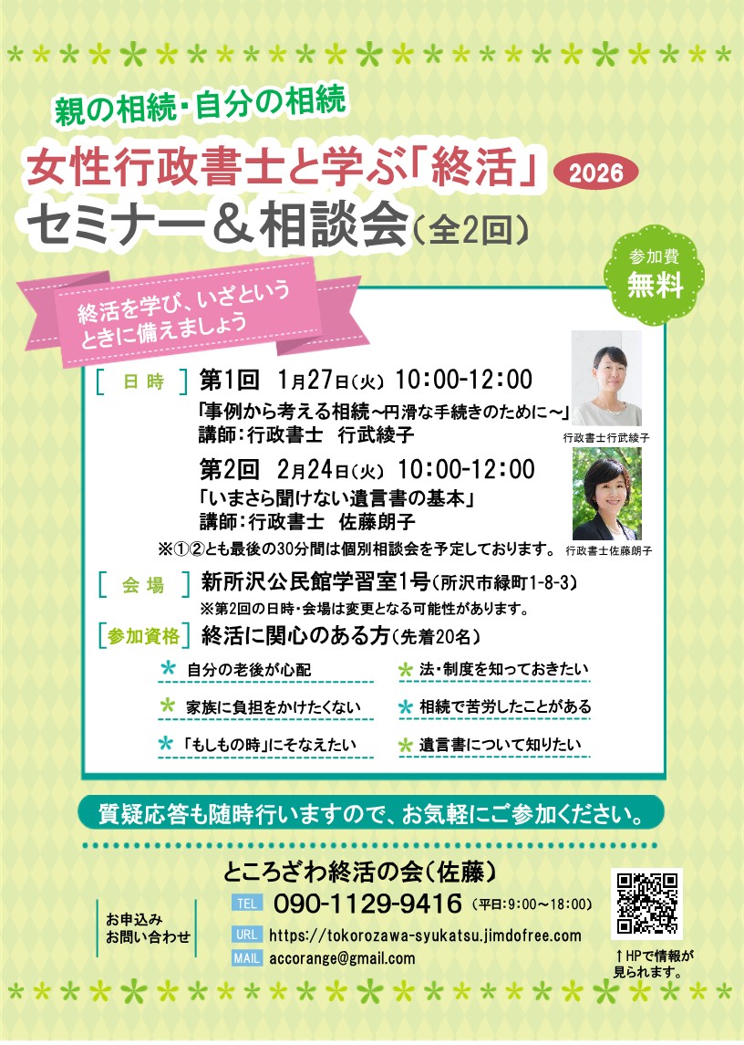 にてところざわ終活の会による終活セミナー&無料個別相談会を行います。